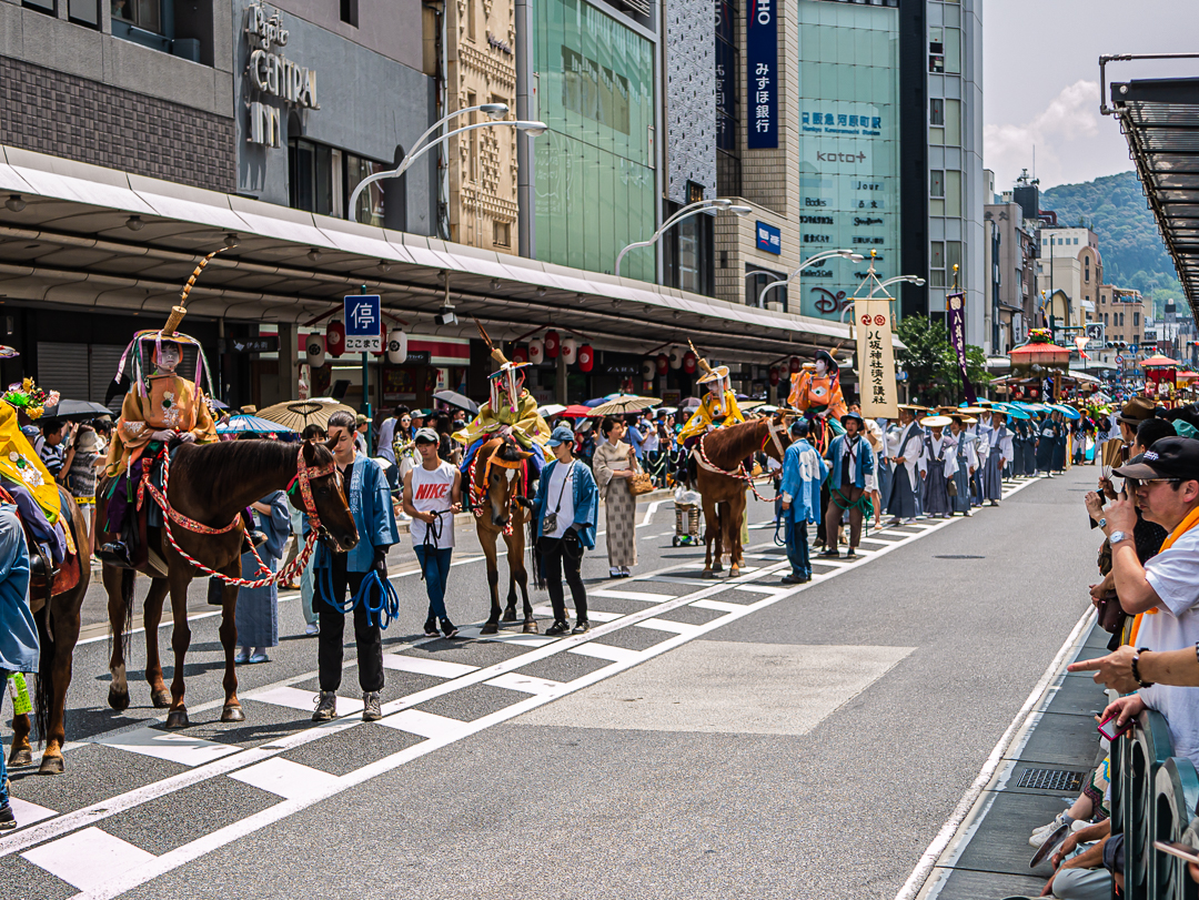 Vores sidste dag i Kyoto var også dagen, hvor festivallens sidste optog fandt sted. Første del af optoget bestod af flere grupper af børn og unge, som vi tror var fra forskellige sportsklubber. Hver gruppe havde deres egen lille “float”, som de skubbede, mens de sang i kor. Det var en varm dag, så man kunne godt se det var lidt hårdt for nogle af de små børn. De voksne som gik med, havde dog en lille vogn med drikkevare, som der blev delt ud fra, når de engang imellem stoppede op.