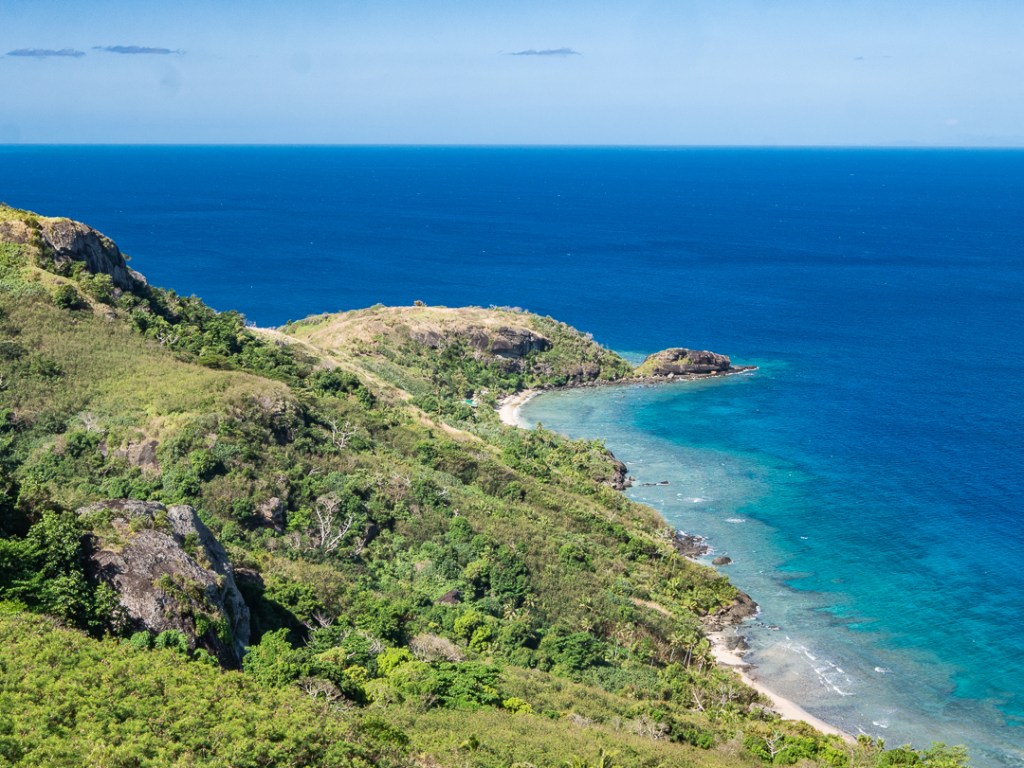 Vores første aktivitet på øen, da det var tørvejr igen, blev en tur op til Vatuvula peak, som er den venstre klippetop der ses på billedet. For at sikre, at vi kom sikkert derop havde vi en af de lokale, Nathan, med os.
