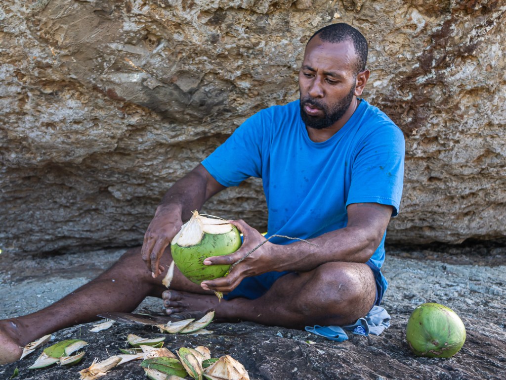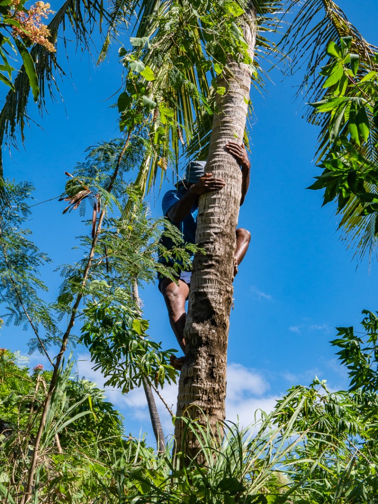 På vejen op, spurgte Nathan om vi havde smagt kokusnødder før. Michael og jeg fik sagt, at vi ikke havde fået det på Fiji endnu og inden vi havde set os om, var han på vej op i en palme for at hente kokusnødder til os.