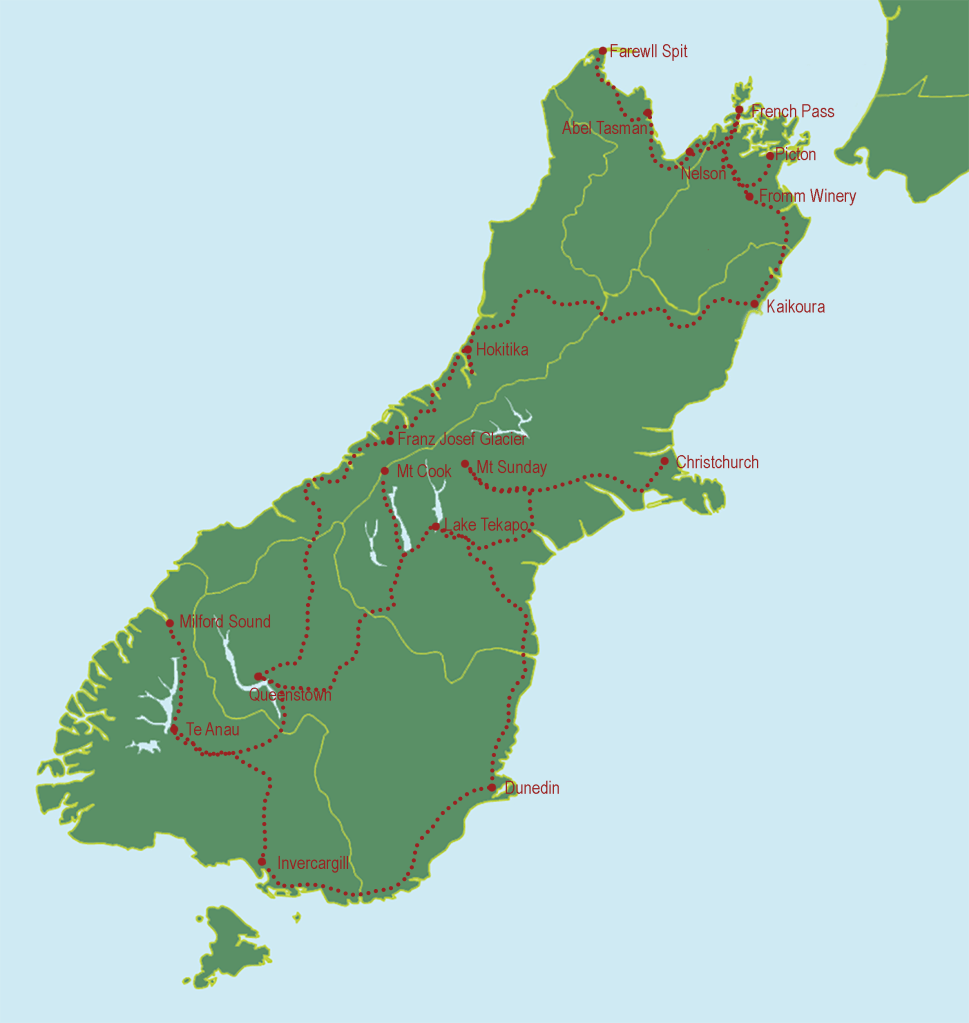 Efter 8 uger i New Zealand og mere end 8.000 km i vores lille bil , er vi klar til et sceneskift. New Zealand har været en fantastisk oplevelse og landet har virkelig meget at byde på. Vi synes vi har været godt rundt på både nordøen og på sydøen, som det også ses på kortet herover.