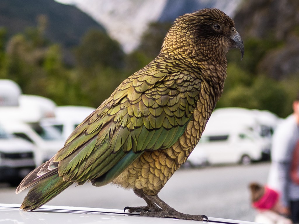Da vi kom tilbage til parkeringspladen og var på vej videre, så vi en del mennesker, som flokkedes omkring en bil. Det skyldes at en af de sjældne bjerg-papegøje, kea-fuglen, var landet på en af bilerne. Michael var hurtig med kameraet og fik taget er fint billede af den.