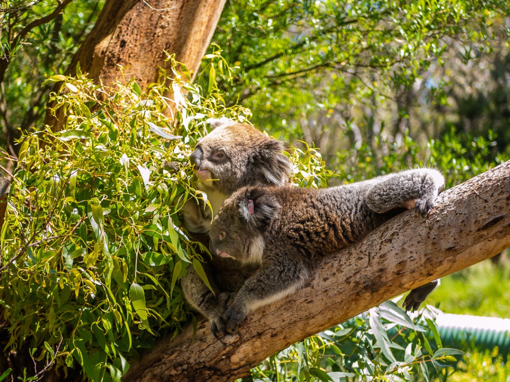 Centeret havde 2 områder hvor der hver især levede 6 koalaer. Koalabjørnen bruger ca. 16 timer om dagen på at sove. Derfor skal man være heldig hvis man vil se andet end sovende koalaer i træerne. Vi var utrolig heldige da 2 af centerets koalaer vågnede op imens vi var der.
