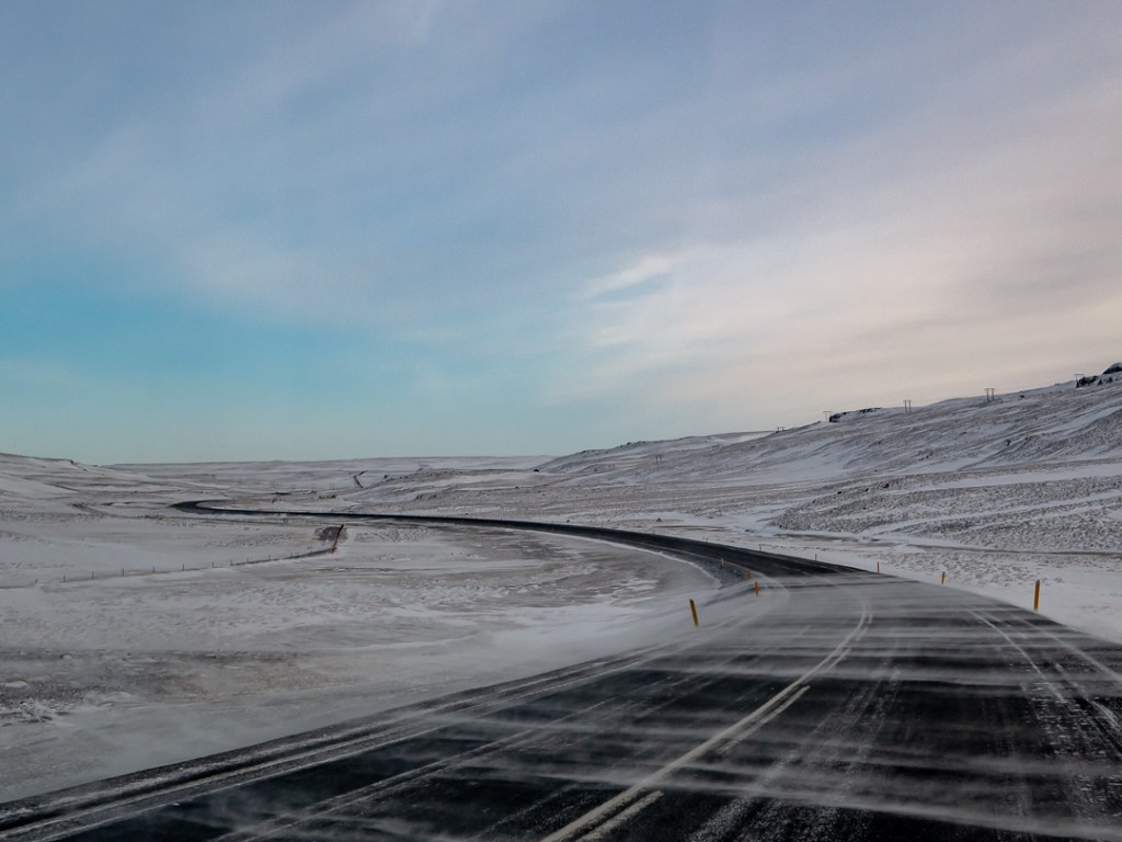Køreturen videre gik uden problemer indtil omkring kl. 14, hvor vi blev mødt med en kø af biler og en flok mennesker, som var ved at skubbe en bil op fra en grøft. Der var en passage med bjerge på hver side og vi kunne mærke hvordan vindstødene ruskede i bilen. Heldigvis så det ikke ud til, at der var sket noget med bilen og folkene i den, så de kunne fortætte videre da bilen var kommet op på vejen igen. Her fra måtte vi køre meget stille og roligt, da der var meget lav sigtbarhed og ret voldsomme vindstød. Men vi kom videre inden det værste af stormen ramte og kom sikkert frem til Reykjavik.