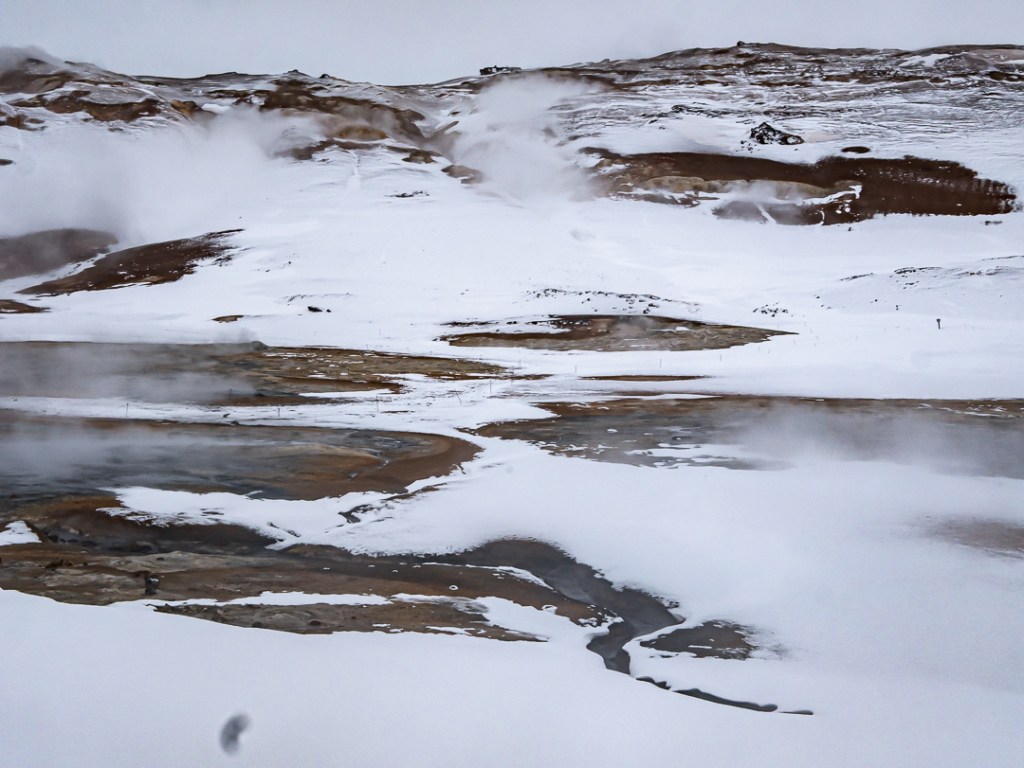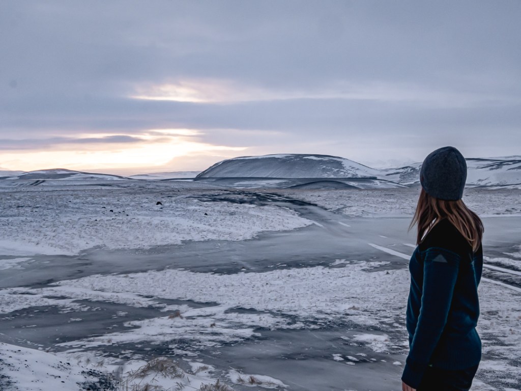 På turen videre kom vi også forbi et geotermisk område kaldet Krafla, som er et af Islands mest aktive vulkanske området. Her kan man bl.a. se det 400 meter høje Hverfjall krater, som man skulle kunne komme op på kanten af og få en flot udsigt over området. Dog bliver vejen dertil ikke ryddet om vinteren, så kort tid efter vi var kørt ind af vejen dertil, mødte vi en flok biler, som holdte på vejen foran os. En af dem kom ned og fortalte, at de var i gang med at vende bilerne, da de var kørt fast i sneen. De rådede os derfor til bare at vende om, hvilket vi også gjorde. Det var en skam vi ikke kunne komme derop, men vi fik stadig lidt fine billede af krateret på afstand.
