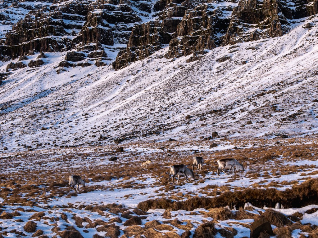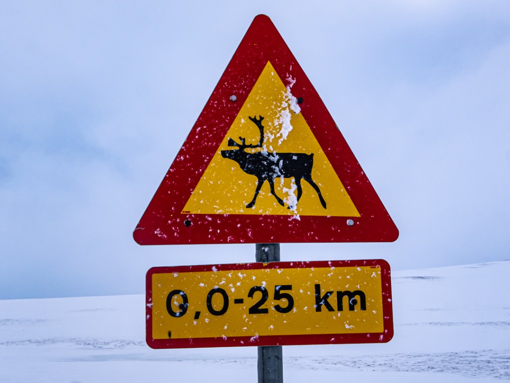 Da vi på turen så skilte, som advarede mod krydsende rensdyr, var vi straks opmærksomme på at spotte en. Ikke lang tid efter vi havde set skiltet, var der granske rigtig en lille flok som krydsede vejen og som vi nåede at få et billede af. Der er bare noget fascinerende ved rensdyr, hvilket nok skyldes, for os, deres forbindelser til julemanden.
