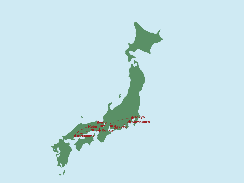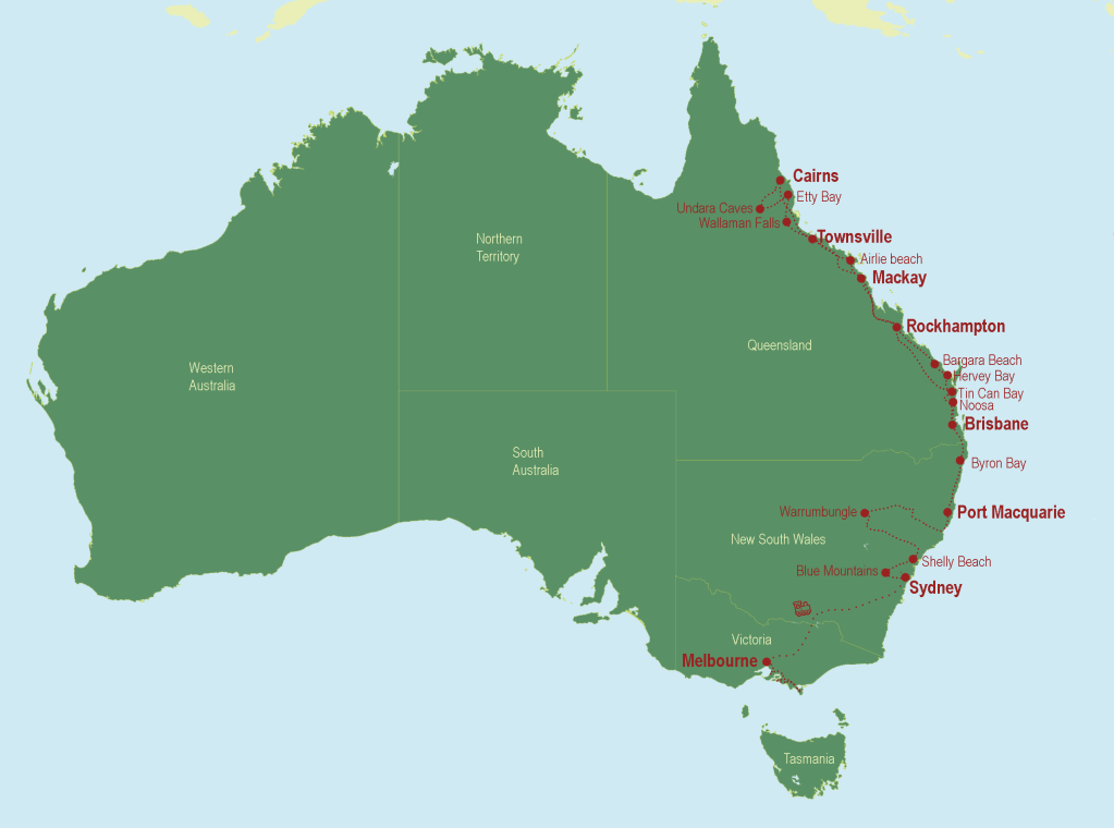 Vi startede turen i Rusland og rejste igennem kontinentet med den trans-mongolske jernbane, med sidste stop i Beijing. Herfra gik vi på opdagelse i Kina i ca. to måneder, hvorefter vi rejste videre til sydøst asien – Loas, Vietnam og Cambodia. I starten af juli rejste vi til Japan, hvor vi tilbragte ca. en måned. Herefter tog vi syd for ækvator til stillehavns ørigerne Vanuatu og Fiji. Efter ca. 6 uger med ø-paradis tog vi videre til New Zealand og Australien. Efter Australien tog vi tilbage til den nordlige halvkugle med et kort stop i Sydkorea, besøg af familie i Canada og tilsidst udforskning af Island og Norge.